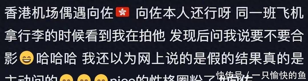 近日,有网友在香港机场偶遇向佐,并且这位网友表示,向佐本人其实很帅,人也很随和。两人同一班飞机,在拿行李的时候看到网友在拍他,并没有反感和怒斥,反而是热情的和网友说,要不要一起合个影。向佐的性格真的很nice。